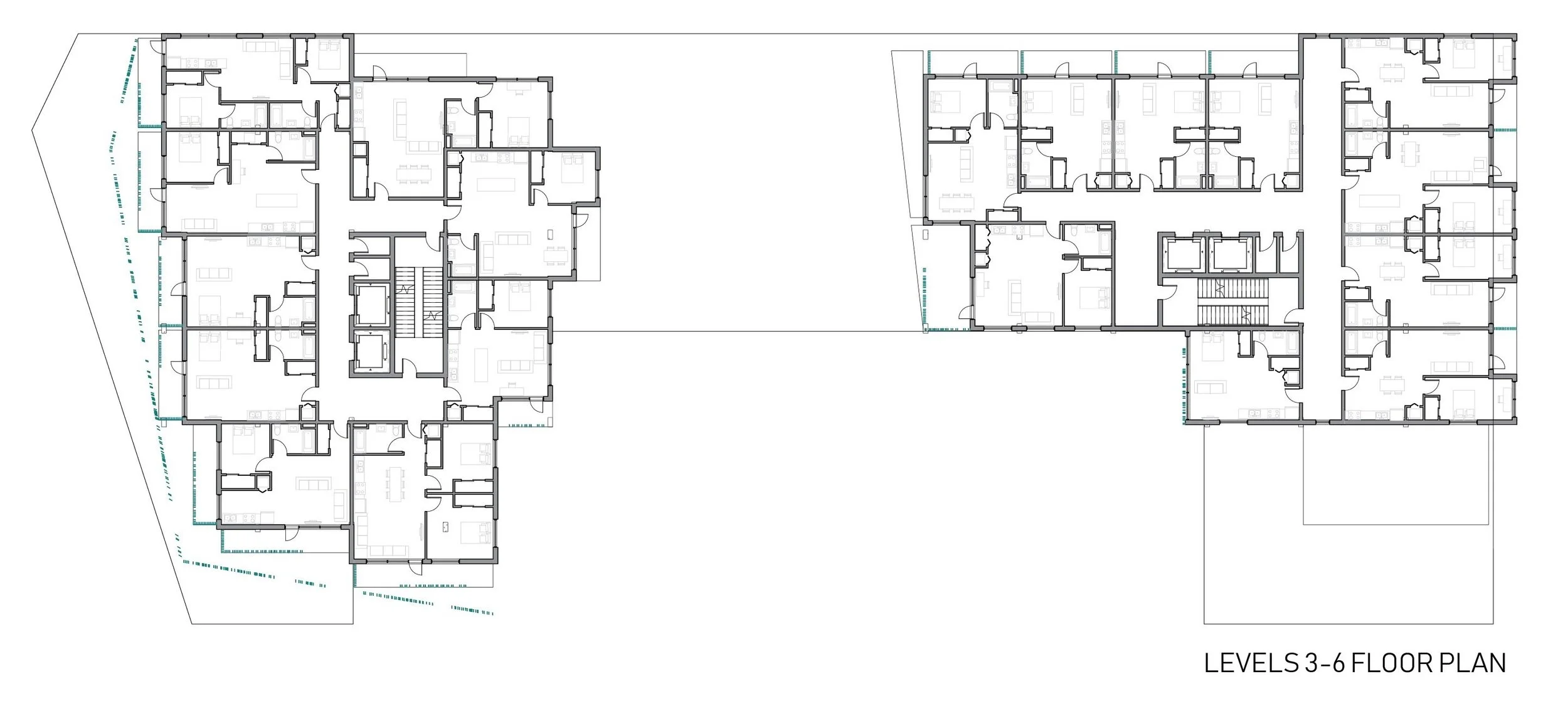 The building's design prioritizes interconnectivity within its surroundings. Residents have the opportunity to enjoy views of external public areas as well as interior multi-purpose rooms. Balconies are strategically oriented toward expansive public spaces, allowing residents to observe and potentially engage in events taking place just outside.
